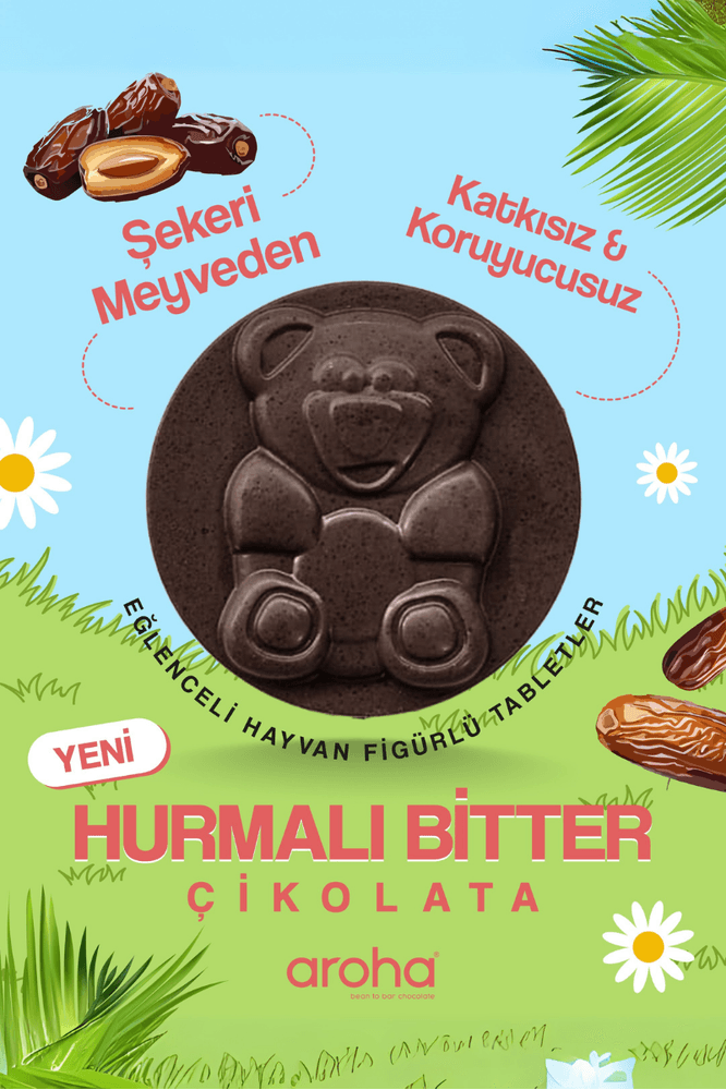 Çocukların seveceği eğlenceli hayvan figürleriyle hazırladığımız bu özel çikolata tabletleri, sadece kakao çekirdeği ve hurmadan yapılır. İçeriğinde rafine şeker bulunmaz; tatlılığını tamamen doğadan, hurmadan alır.