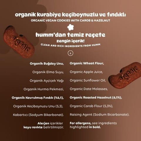 Humm Organic’in muhteşem lezzetlerinden tadına doyamayacağınız Organik Vegan Keçiboynuzlu ve Fındıklı Kurabiye, keçiboynuzunun damaklarda iz bırakan tadını fındıkla harmanlıyor ve ortaya harika bir atıştırmalık çıkarıyor. Keçiboynuzunun sağlığa olan faydalarını tatlı bir mola ile deneyimlemeye hazır olun! Keçiboynuzu ve fındıkla dolu olan bu organik kurabiye, yediden yetmişe herkesin öğünlerine eşlik ediyor.
