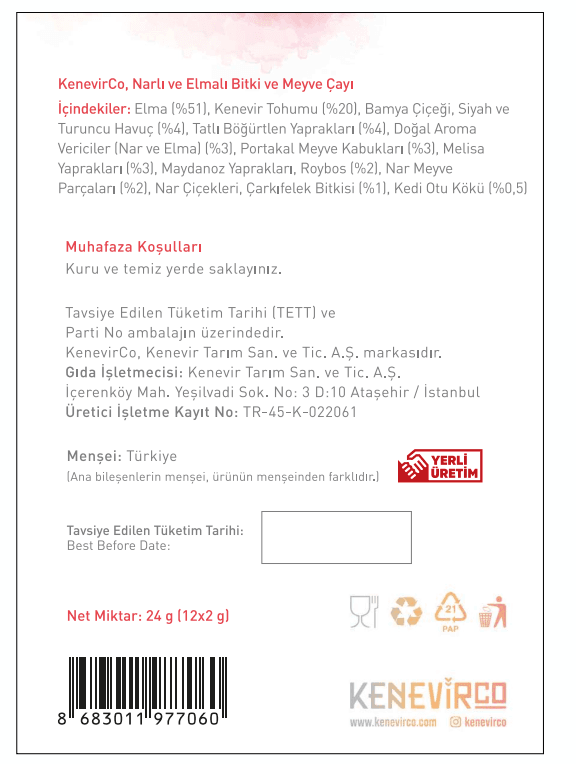 Elma (%51), kenevir tohumu (%21), bamya çiçeği, siyah ve turuncu havuç (%4), tatlı böğürtlen yaprakları (%4), doğal aroma vericiler (nar-elma %3), portakal meyve kabukları (%3), melisa yaprakları (%3), maydanoz yaprakları, rooibos (%2), nar meyve parçaları (%2), nar çiçekleri, çarkıfelek bitkisi (%1), kedi otu kökü (%0,5).