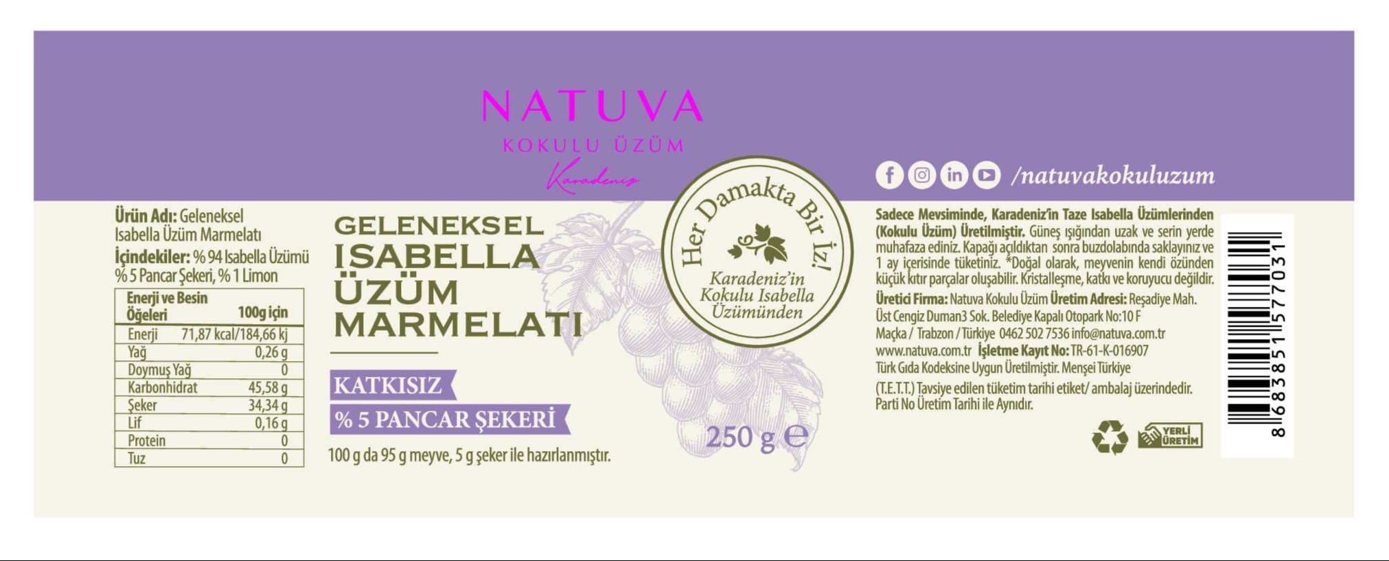 Karadeniz Bölgesinde mevsiminde yetişen, kokulu üzüm, isabella, çilek üzüm, kara üzüm, ilaç üzüm gibi isimlerle anılan, özenle ve el ile hasat edilmiş kokulu üzümlerden katkısız olarak buhar kazanında pişirildikten sonra kapakları kapatılarak otoklavda hazırlanmıştır. Bölgemizden toplanan kokulu üzümler yıkanıp pişirildikten sonra süzülür ve marmelat kıvamı için düşük kaynama noktasında pişirilir. Cam kavanozlara alındıktan sonra kapağı kapatılır ve geleneksel yöntemle muhafaza edilir. Kokulu Üzüm Marmelatı hiç bir katkı maddesi veya koruyucu içermez. Su ilavesi yoktur.