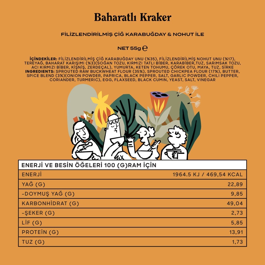 Filizlendirilmiş Çiğ Karabuğday Unu (%35), Filizlendirilmiş Nohut Unu (%17), Tereyağ, Baharat Karışımı (%3) (Soğan Tozu, Kırmızı Tatlı Biber, Karabiber, Tuz, Sarımsak Tozu, Acı Kırmızı Biber, Kişniş, Zerdeçal), Yumurta, Keten Tohumu, Çörek Otu, Maya, Tuz, Sirke.